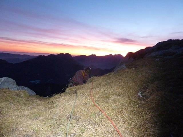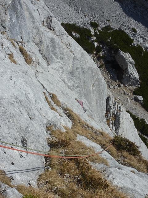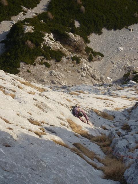 Štk je tot prav, saj ne pomnem, da gda novembr nebi izpovnu svojga deževnega renomeja. No letos je bvo tk zato smo se bistveno del kot je običajno zadrževali v lepem in toplem vremenu v domačih hribah. Zadno soboto sma s Frančko – bi mu vohko reku kr soplezalec iz Pece – spet zagnava proti Kordeževi Rami. Ž na sedlu pod Malo Peco nama je bvo jasno, da v steni nama sama, saj sma dohitevava dve postavi, ki sta se neplaninsko in poznavalko gibale proti odcepu zavarovana – normalka. Bva sta letošnja naveza Vačn – Drejček. Po razgledvano in špranciru po zavarovani smo hirt pršli do fuzbal pvaca. Sam, da je dons za razliko, Franček zbral kamp pvac v zavetrju med rušovjo. Poba sta se podava v bol vzhodn dev Rame, mdva pa v ‘centralnega’ in lezva Člansko. Klub relativno zgodnev vstopu sma smer zlezva v soju žarometov, ko je za Kamniško Savinskam Lublana že goreva. Smer je bva prav fajn, edino v zgornem delo fejst razbita in naložena. V cevi smeri pa sma najdva celo pet klinov:)
